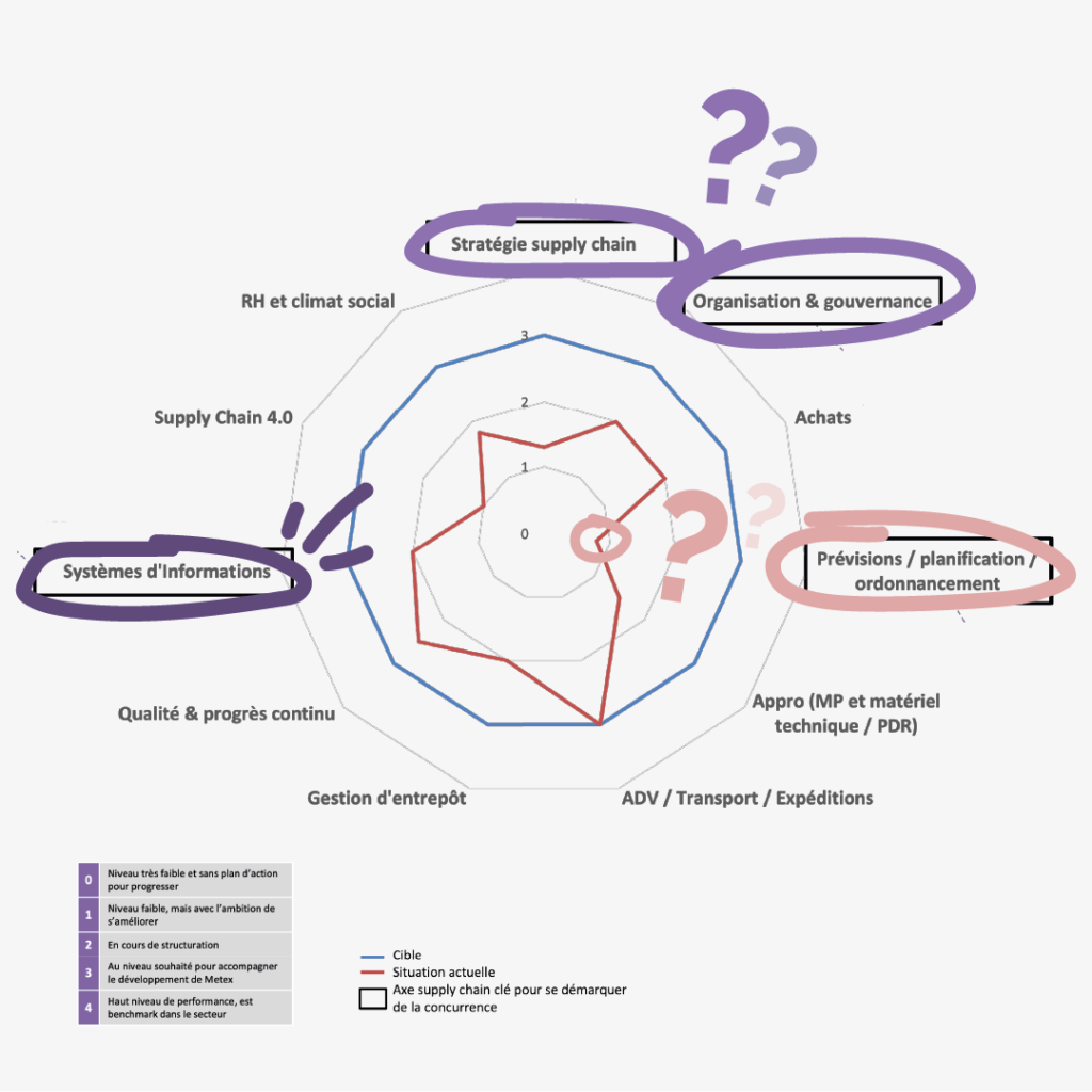 En premier lieu, nous évaluons toujours le niveau de maturité de l’entreprise sur un sujet précis (Supply Chain, maintenance…) ou bien sur l’ensemble de son organisation (360°).